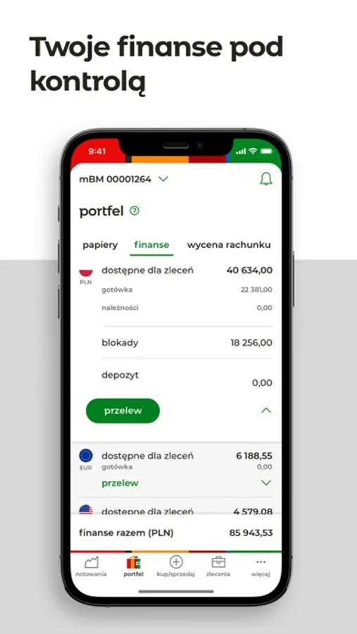 • przeglądać historie operacji finansowych, zleceń i transakcji