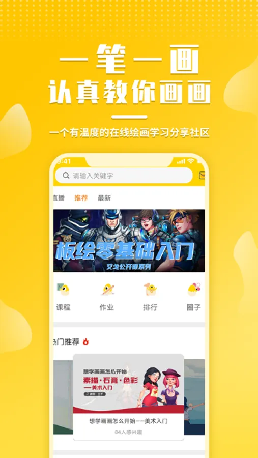 精品板绘课程体系,美术基础、软件入门、板绘基础、日韩系插画、古风插画、原画场景、角色设计等各类直播课程应有尽有。更有海量绘画学习资源,老师作品点评,社区分享互动等,零基础学习毫无压力!