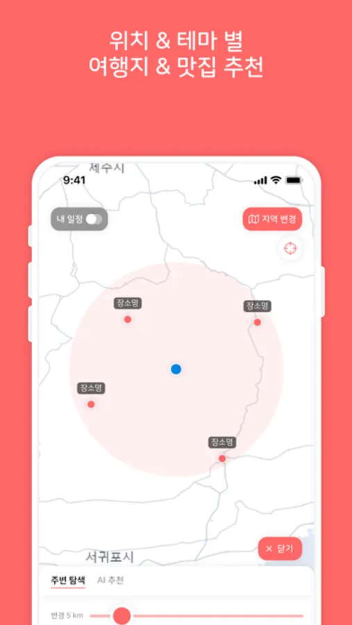 - 내가 지정하는 위치 & 반경에 따라서 각 테마 (맛집, 관광지 등)별 장소 추천 결과를 지도로 보기!