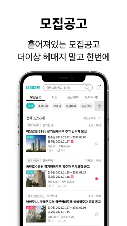 (새로운 모집공고, 관심지역 맞춤공고, 경쟁률 발표 등)