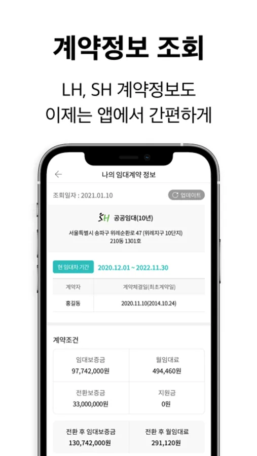 - 임대차 계약조건과 보증금 납부현황 및 권리침해유무까지 한 번에 조회