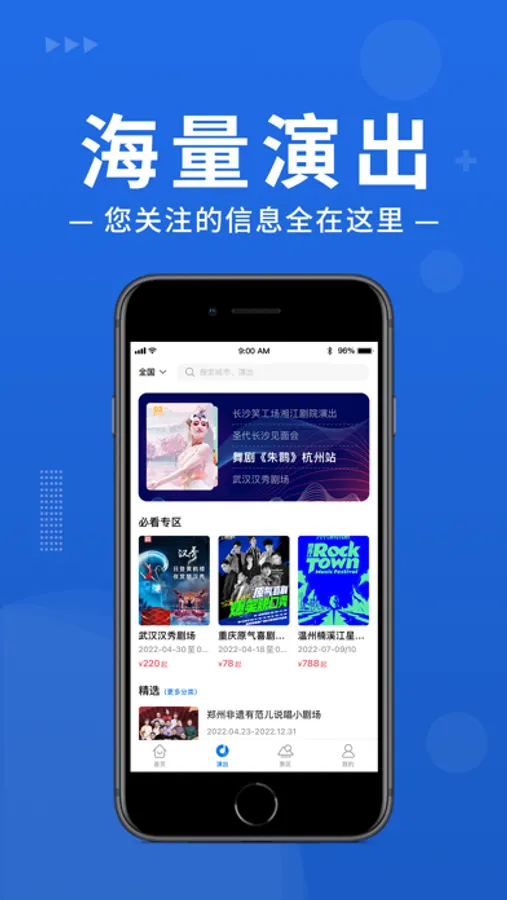 热门演出即时推送,话剧歌剧、演唱会、音乐剧、舞蹈、曲艺杂技、展览大全等应有尽有;