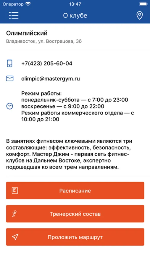 С помощью приложения вы можете следить за новостями, расписанием клубов, оперативно получать информацию об изменениях в расписании и специальных предложениях, оnline заморозка.