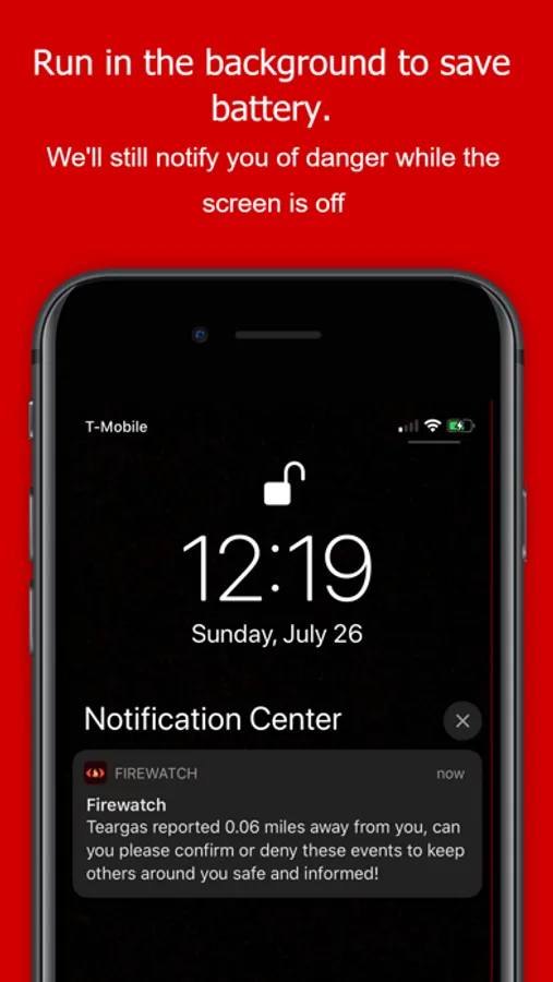 Firewatch can also run in the background while your screen is off to conserve battery life, we will still notify you if danger is nearby.