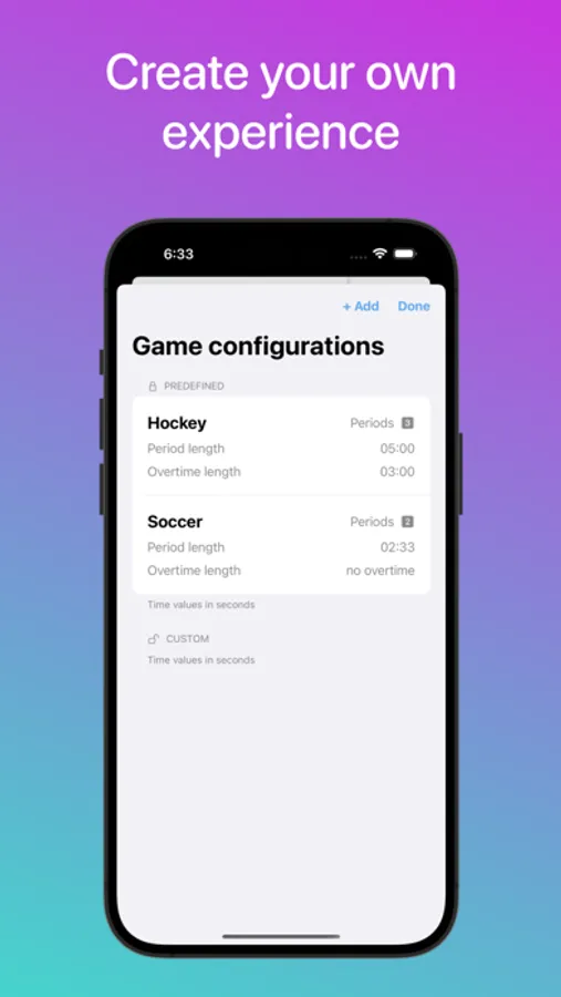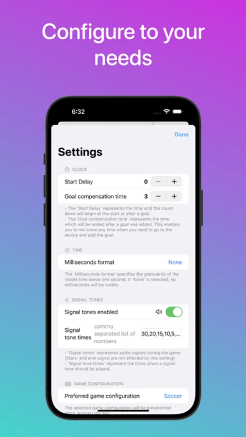 • Customize your game configuration. 2 halves, 3 periods, 4 quarters ... configure it based on the game you are playing.