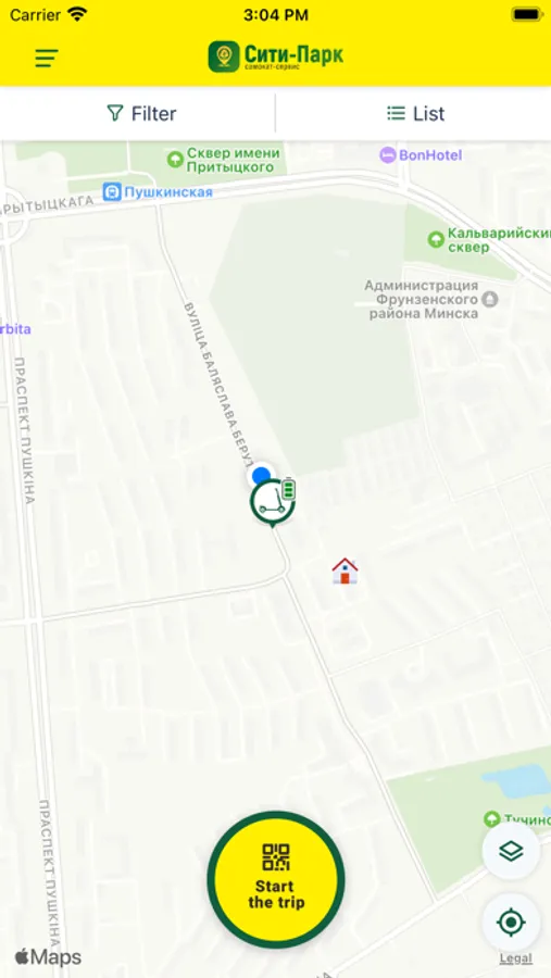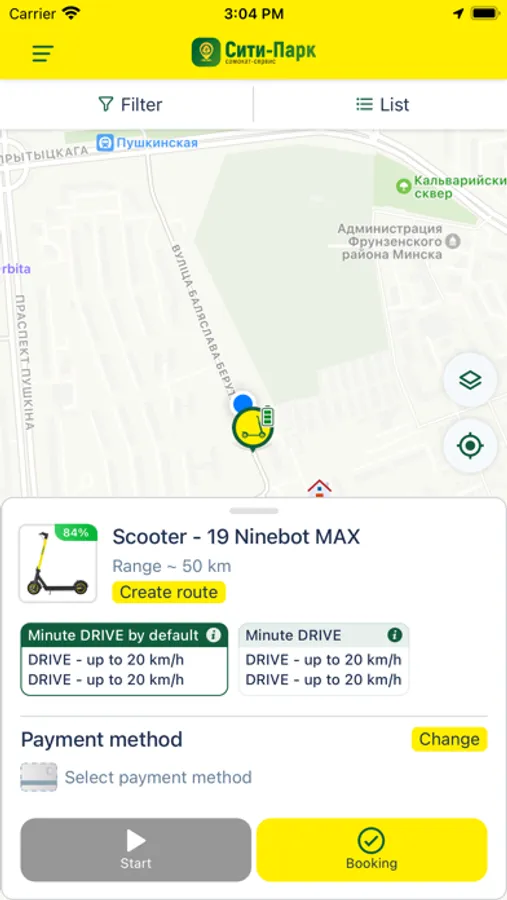 - Найти на карте интересующую вас технику (электросамокат, велосипед, веломобиль);