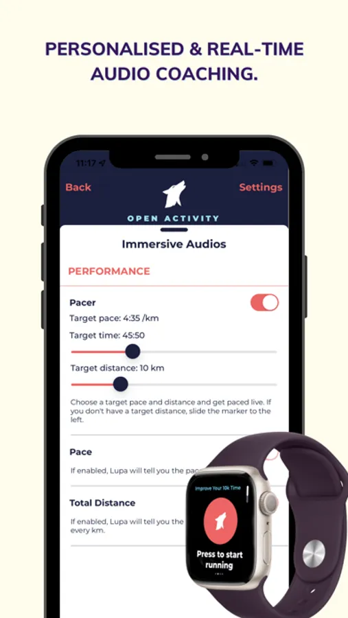 With Lupa, you can set a target pace and distance for your runs and be guided and motivated in real-time to achieve your goals. Whether you want to target a fast time, manage your heart rate, learn what a certain pace feels like, or simply test yourself and have some fun, the Lupa Pacer will guide you, encourage you, and keep you on track.