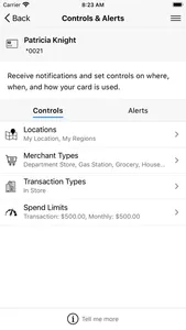 Set spending limits to decline transactions above your thresholds. Monitor activity by category such as gas stations and restaurants, and by type: in-store purchases, e-commerce transactions and ATM transactions.