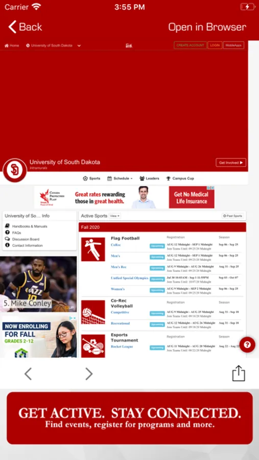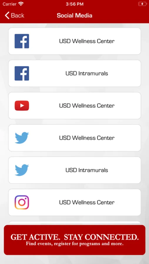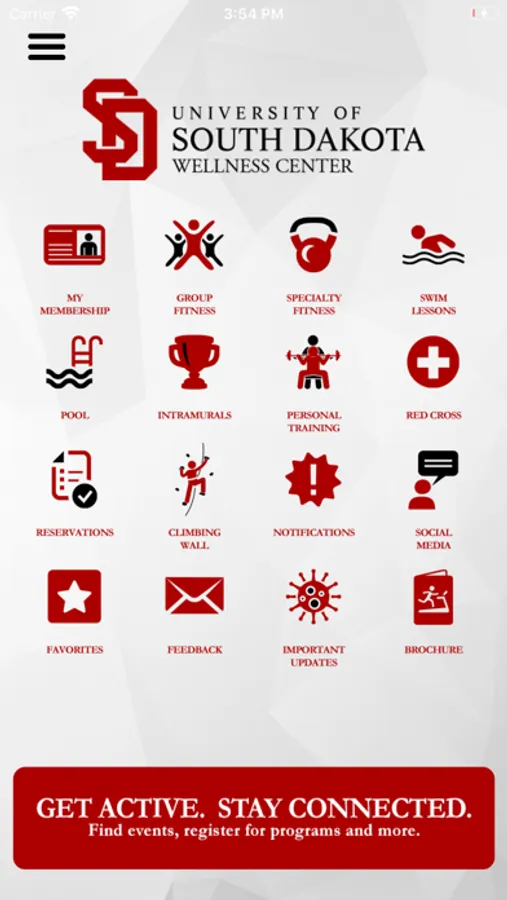 The official app of the University of South Dakota Wellness Center. Includes Group Fitness, Personal Training, Climbing Wall, Aquatics, Safety Education, Intramurals and more! Stay up to date with Wellness Center programming by downloading our app. Get access to facility hours, event schedules, and programs.