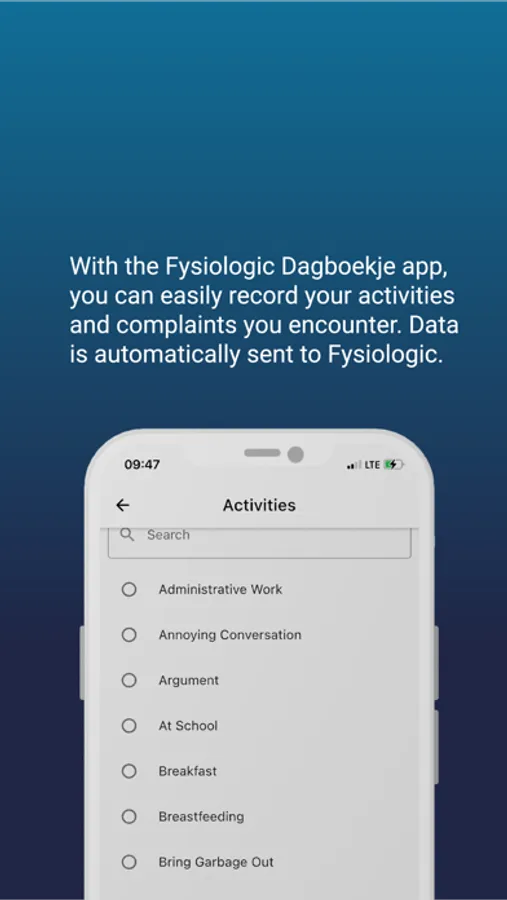 U heeft een ECG Recorder (Holter) meegekregen om uw hartritme te registreren. Daarnaast is u gevraagd uw activiteiten en klachten bij te houden in een dagboek. Met de Fysiologic App kunt u heel gemakkelijk uw dagboek bijhouden. Het enige wat u hoeft te doen is de activiteit en klacht(en) aantikken waar u last van heeft. De Fysiologic App vult zelf de datum en het tijdstip in.