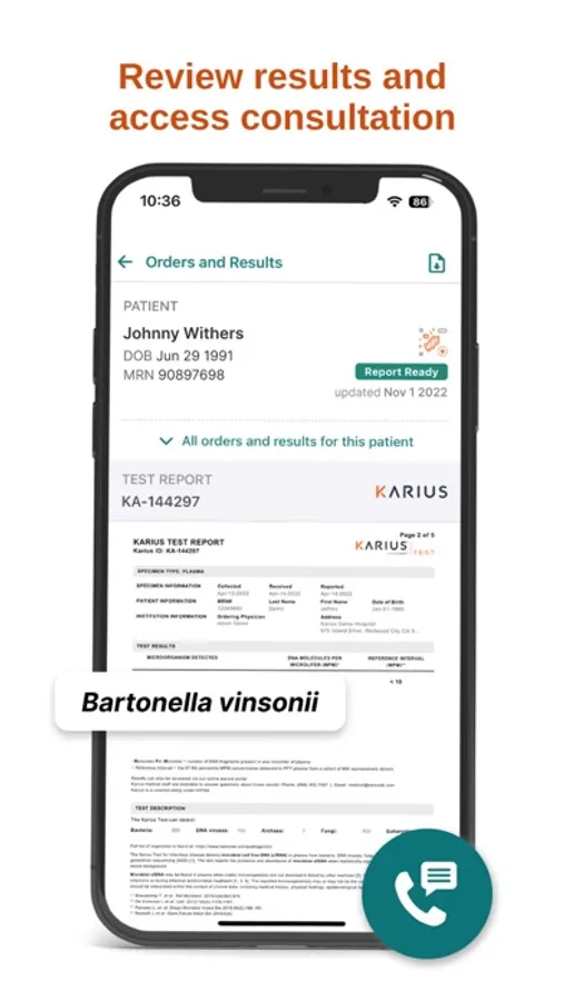 The app enables one-touch access to the Karius team 24/7 via text or call to discuss results or get the status of an order.