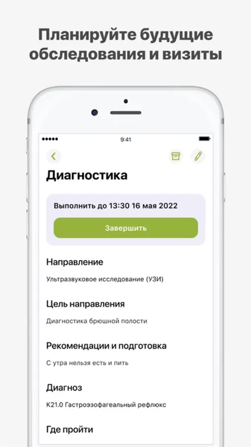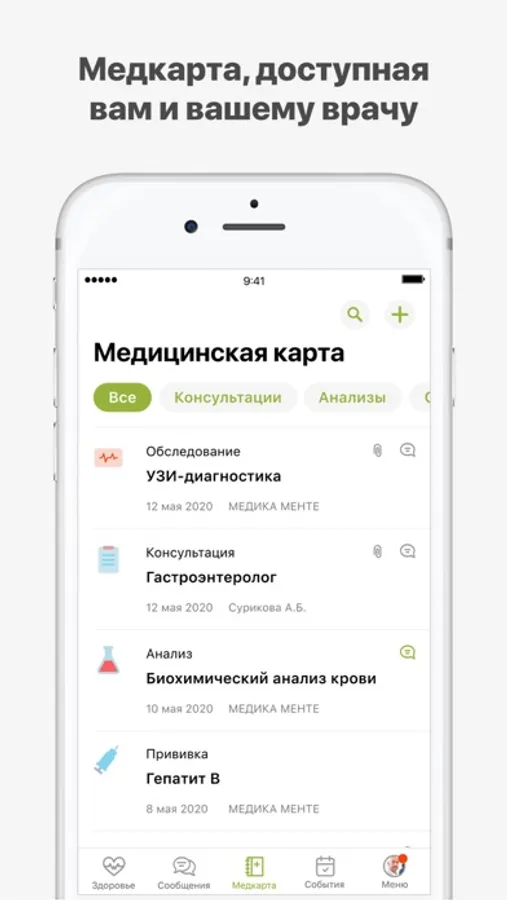 – Храните заключения, результаты обследований и анализов в одном приложении;