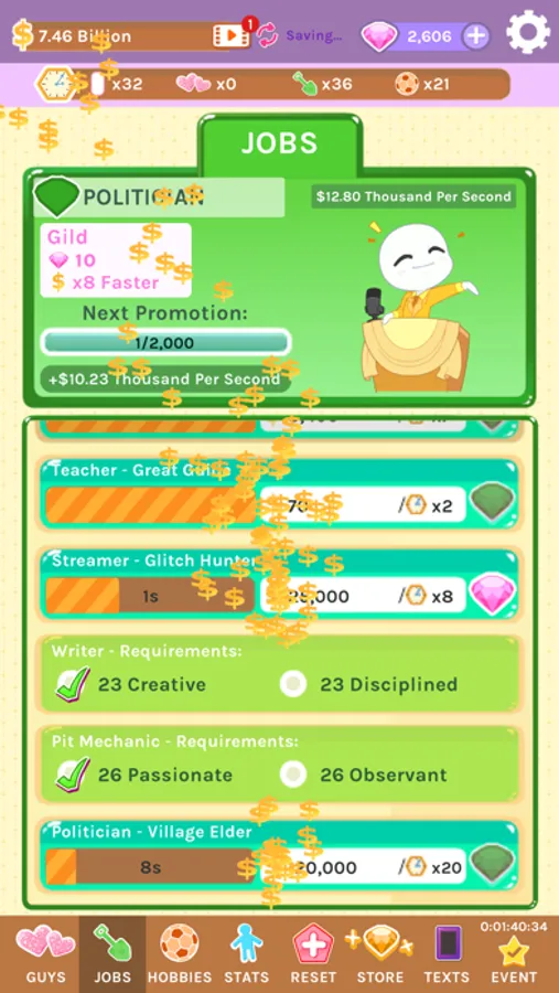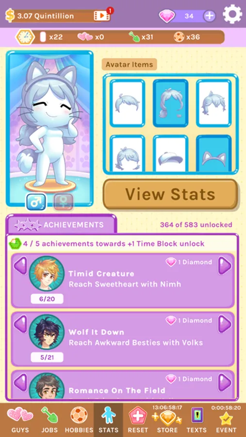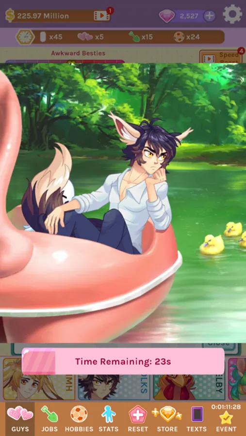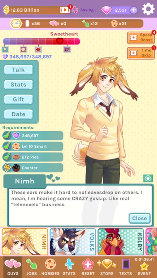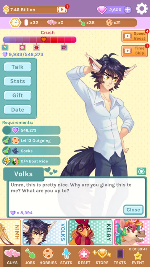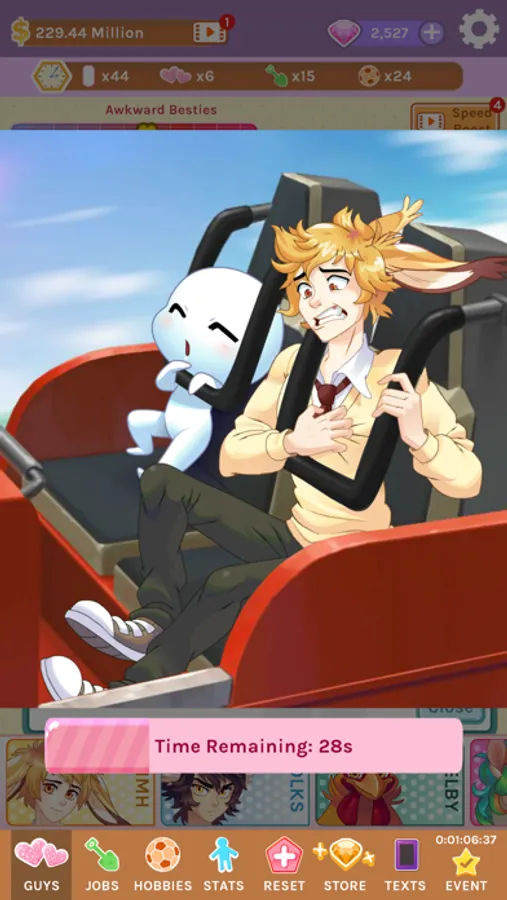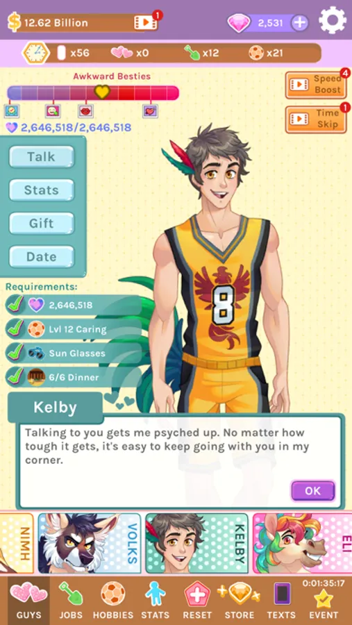The gameplay is easy! The player must choose how they spend their time wisely, by working various jobs, earning stat points, and arranging dates and gifts for their love interests. A mix of strategy and story, the player will gradually become an accomplished dater, and have the chance to woo a TON of hawt guys with more planned for the future.