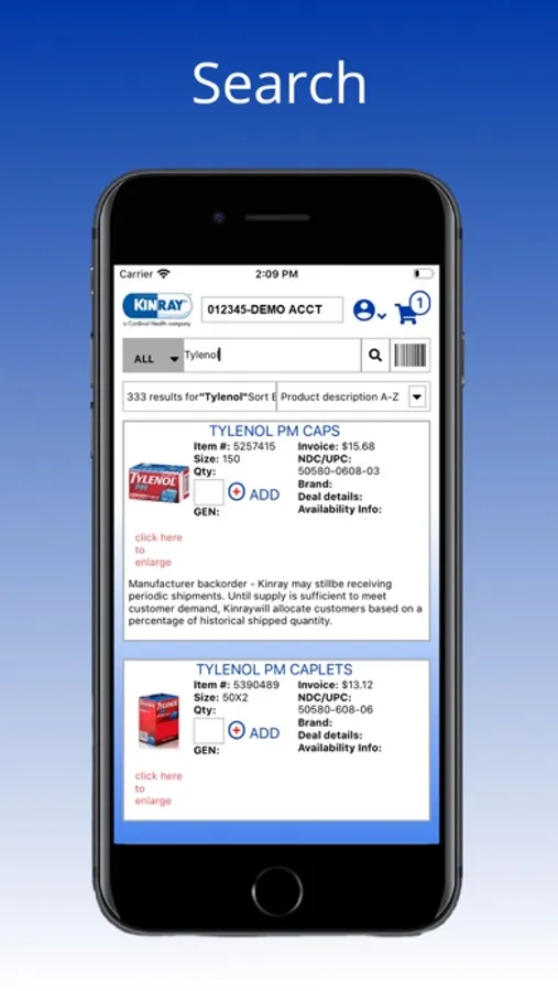 The Kinray Weblink Mobile App is intuitive to navigate, fast, and replaces the need for a scanner device. The app allows you to search items, scan UPC & NDC barcodes, update quantities, and then simply add items to the Shopping Cart.