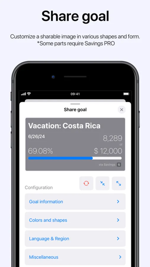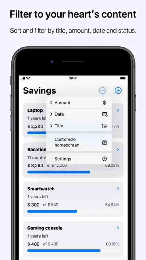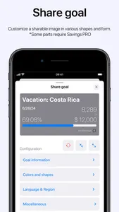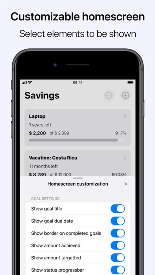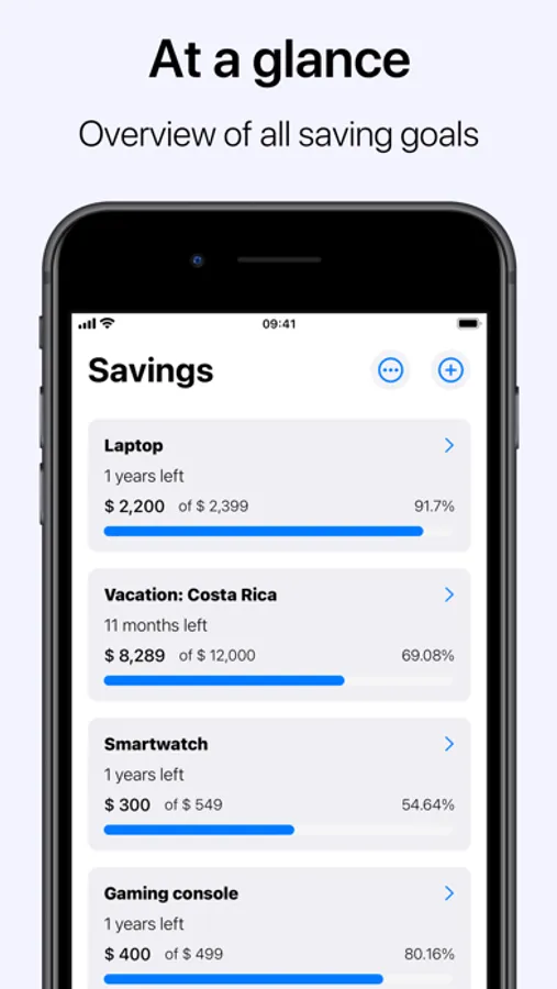 Savings features an intuitive and familiar interface, allowing for easy and painless goal management to reach your goal. In addition, a complete overview of all saving goals is available, as well as sorting and filtering of goals based on criteria. Opening a goal yields a detailed overview, current progress and past contributions, sharing of goal as an image and more. Supports synchronization across devices*, locking Savings with biometrics (Face-ID/Touch-ID)*, along with customization of app icon*, accent color* and light/dark setting based on system appearance. Reminders in the form of notifications gives a quick way to add contributions*.