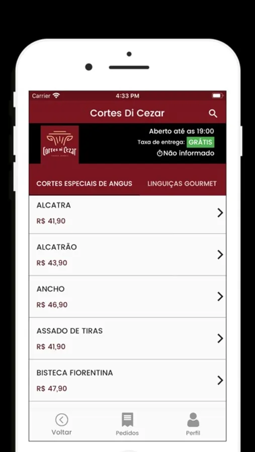 - cardápio ilustrativo, com preços dos produtos;