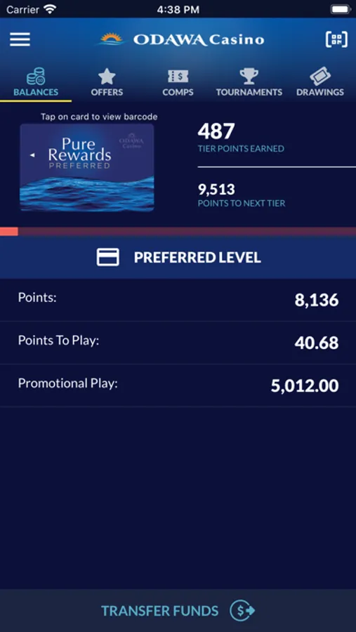 Odawa Casino mobile app allows pure rewards members access to player information, notifications, and touchless card-in at EGMís. Pure rewards members can view their Tier Level, Tier Points Earned, Points to Next Tier, Points Balance, Promotional Play, Offers, Vouchers, available tournaments, and drawing tickets. Members can also access the Odawa Casino website and other 3rd party sites connected to Odawa Casino Resort.