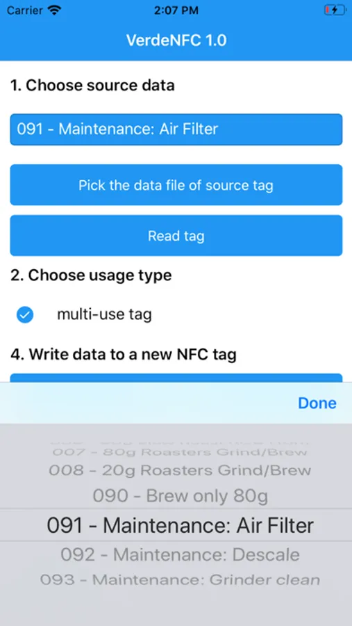 Writes MIFARE UltraLight(R) Tags, that the Coffee Maker Bonaverde Berlin aceepts to control its function. There are several data templates included in the app, can be read from files or exisiting (also already used) NFC tags. This app allows to write multi-use Air filter reset tags. You can find the sources of this app at http://github.com/btrappe/VerdeNFC.
