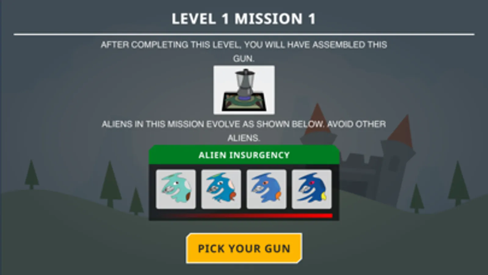 If you convert all the target aliens to their highest evolutionary stage before the timer runs out, you have completed that level, and you will receive a component that goes into the assembly of your next gun. There are ten components for each gun, and as you receive each component, you will see the gun start to take shape.