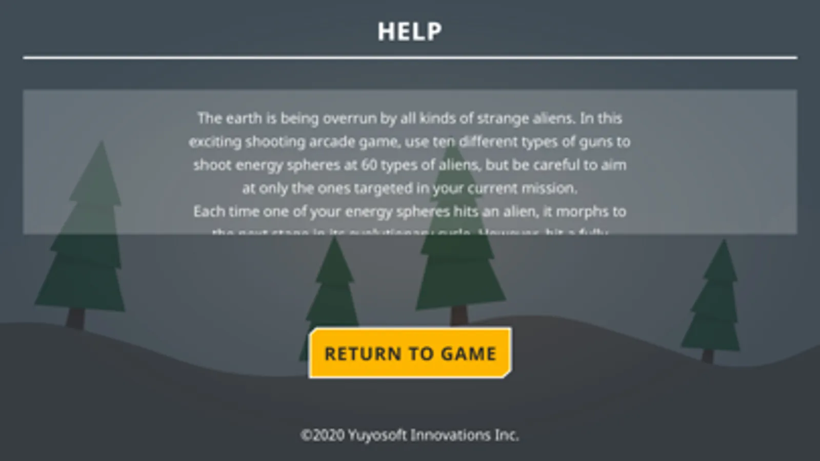 Each time one of your energy spheres hits an alien, the creature morphs to the next stage in its evolutionary cycle. However, hit a fully evolved alien and it will fall back a stage in its evolution.