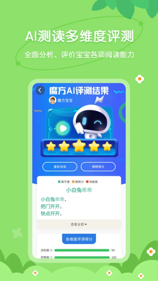 魔方AI阅读平台是国内首创的充分利用大数据、云计算、移动互联网等新一代信息技术,打造“独立阅读能力培养+家校融合+智能跟踪体系”的智慧教育软件。是以苏霍姆林斯基教育思想和加涅心理学教学论为基础,结合艾宾浩斯的遗忘曲线,国内首创的儿童自适应AI分级阅读平台,是让孩子以最快的速度进入独立阅读的神器,全国唯一能让孩子提前3~4年进入独立阅读的智能系统。