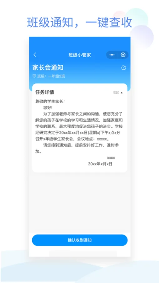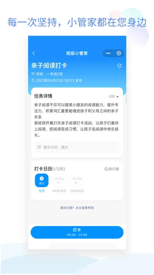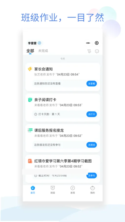 班级小管家是一款高效的家校沟通工具,主要功能有:作业收发、在线批改、每日打卡、问卷调查(接龙)、私密成绩单等十余项特色功能,支持多家长、多用户同时使用。老师可以随时查看并导出每项任务的完成明细,并将学习资料发送至班级网盘中。家长则可以随时了解孩子的作业完成质量及课堂表现等。最终通过班级小管家,大幅提升家校信息沟通效率,提高班级信息化管理水平,让教育更方便。