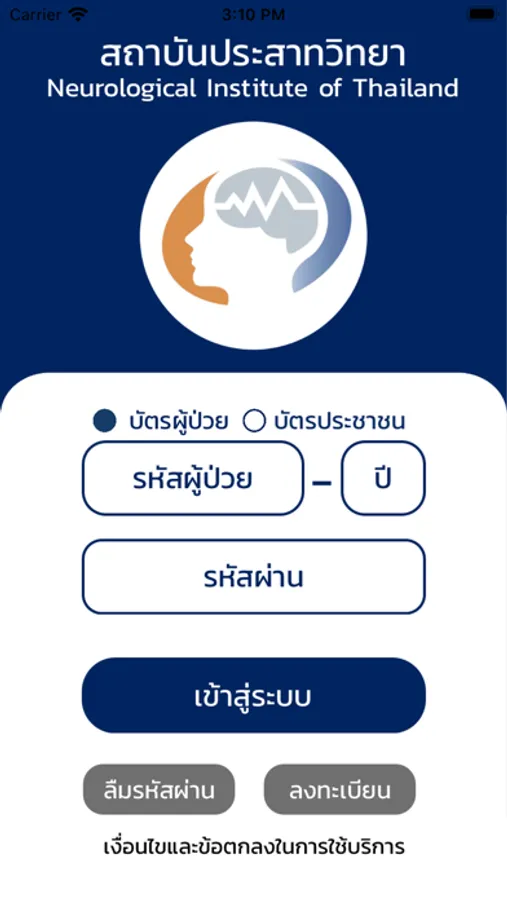 ผู้ใช้งานต้องทำการลงทะเบียน Consent form ที่ห้องบัตรโดยแจ้งกับเจ้าหน้าที่ว่า ลงทะเบียนใช้งานแอพพลิเคชั่นของทางสถาบันประสาทวิทยา ก่อนเท่านั้น