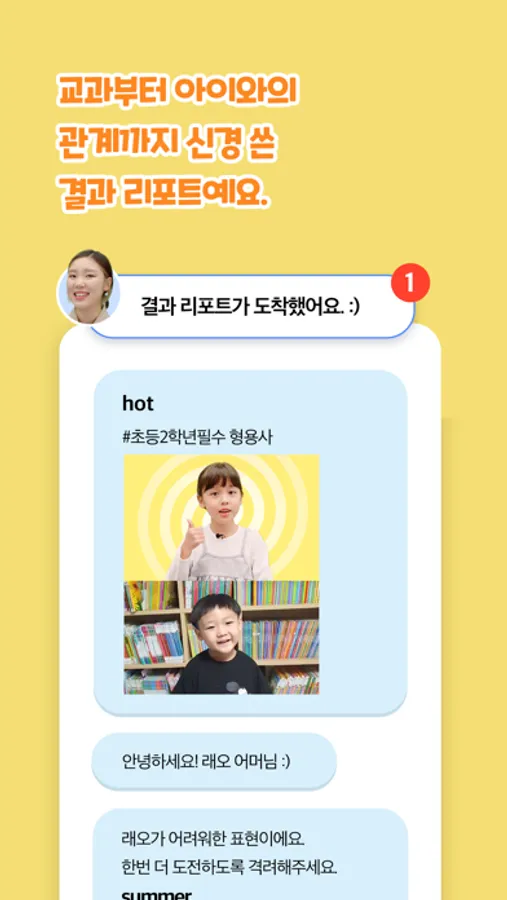 2. 아이가 태블릿으로 학습을 하면, 학습 결과 영상과 리포트를 해당 앱으로 바로 공유해드려요.