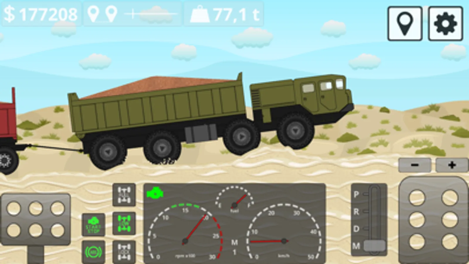 The vehicles have a complex technical model with realistic behaviour. There is a possibility to control different modes of transmission: connect all-wheel drive, lock inter-axle differential, enable low-range gears.