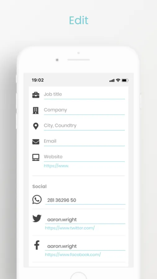 Create your profile: add your profile picture, description, contact information, e-mail, address, your job title and company, links, photo gallery and all your social media (up to 17 social media). Add your Facebook, Instagram, WhatsApp, Twitter, Pinterest, YouTube, LinkedIn, Skype, Snapchat, Apple Music, TikTok, Telegram, SoundCloud, Behance, TripAdvisor, Spotify and web page.
