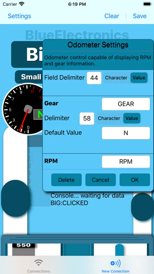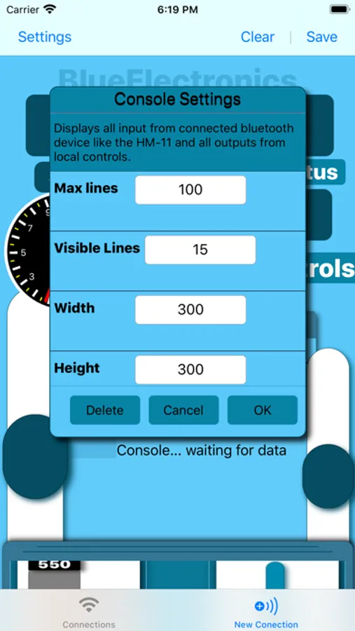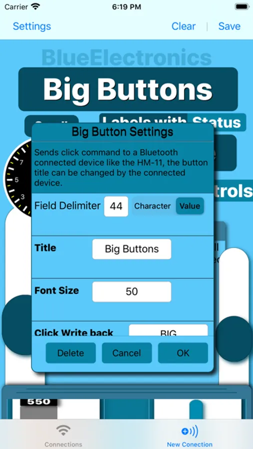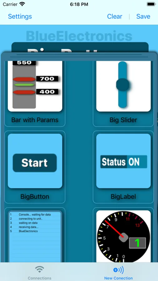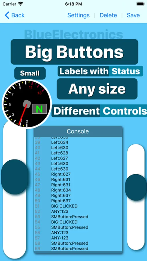 BlueElectronics allows you to create your own communications display with multiple customizable controls to communicate with your bluetooth device, controls are able to send and receive data, controls setting can be changed dynamically by they connected device.
