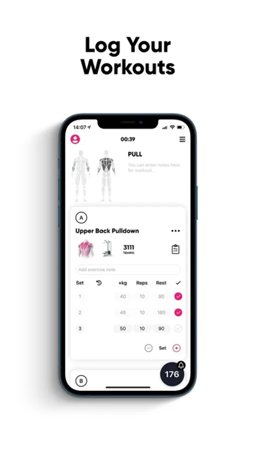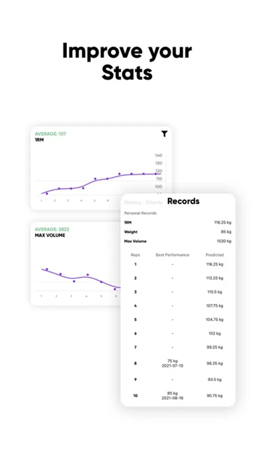 - Track your progress for Volume, Used Weight, and 1RM progression