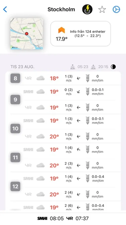 MultiWeather låter dig att se väderprognosen i Sverige från SMHI och YR samtidigt, för att kunna jämföra prognoserna. Fungerar också för att se YRs prognos på fler ställen i världen