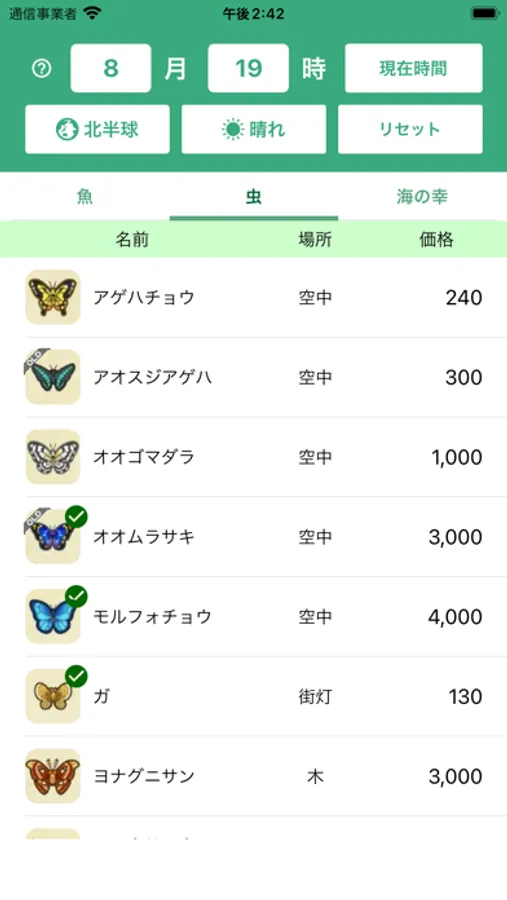 名前順や価格順などの並び替えも可能です!!!捕まえた印も付けられて便利!