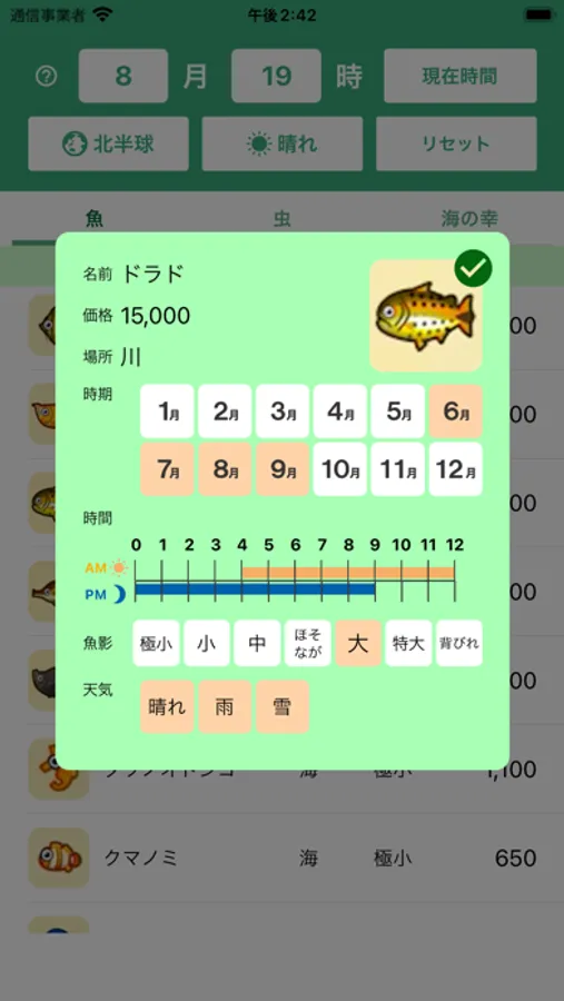 設定した時期等に現れる魚などが一覧で表示されます。