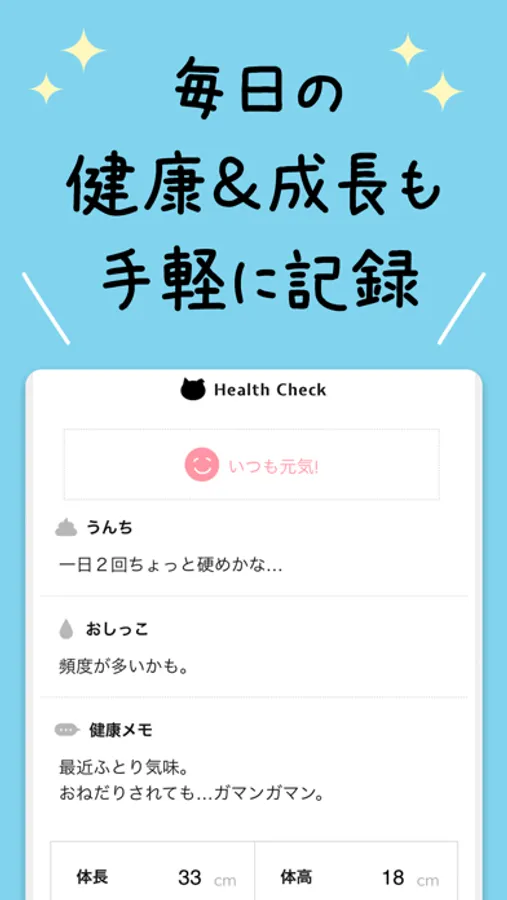 ・ 毎月のトピックスや体長・体重、健康なども記録できます。