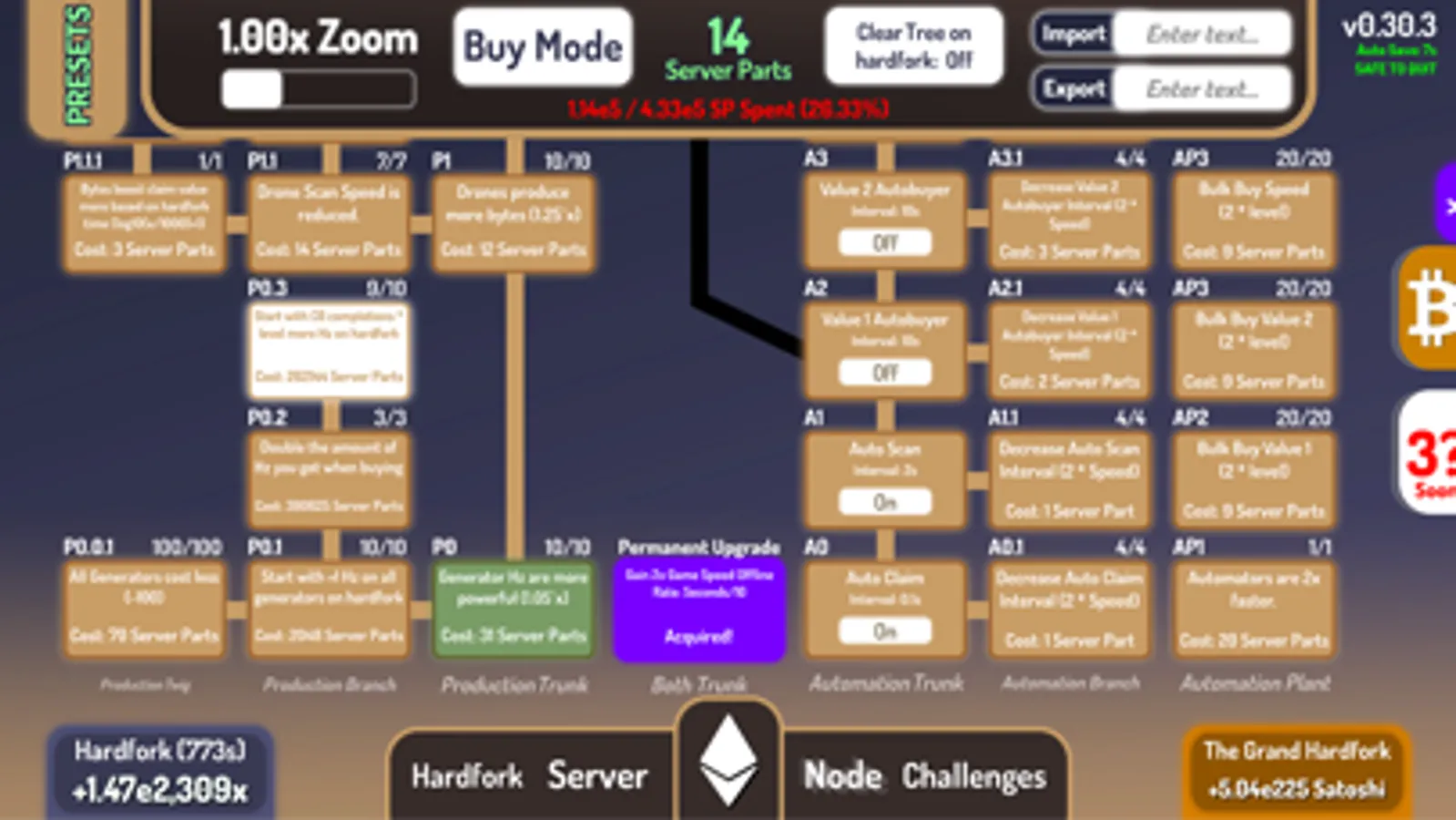 There are two big upgrade trees in the game. The first one "Server," which is where you spend your server parts! This one is located in Ethereum. The second one "BIT Upgrades" is located in Bitcoin!