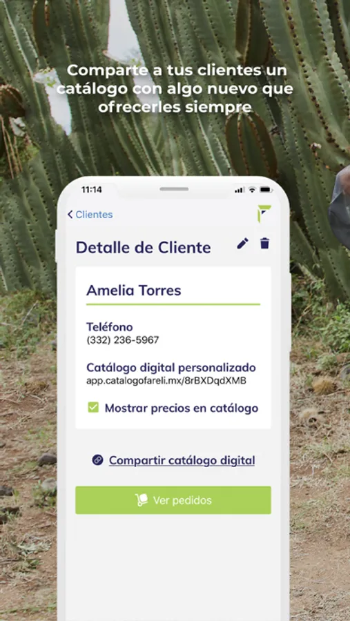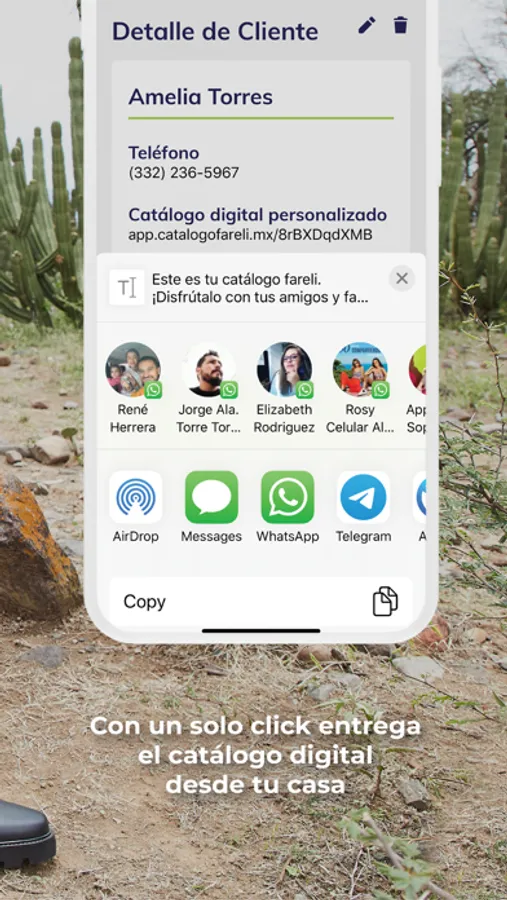 4. Muestra el Catálogo a tus clientes sin salir de casa solo tendrás que compartir un Link de nuestro Catálogo y mandárselo a tu cliente por cualquier red social ya sea WhatsApp, Facebook, Instagram, EMail etc. Y en pocos segundos tu cliente podrá abrir el enlace y escoger el producto que más les guste, una vez terminado su pedido, solo deberán de pulsar el botón confirmar pedido y tú lo recibirás ordenado en nuestra App de tu celular.
