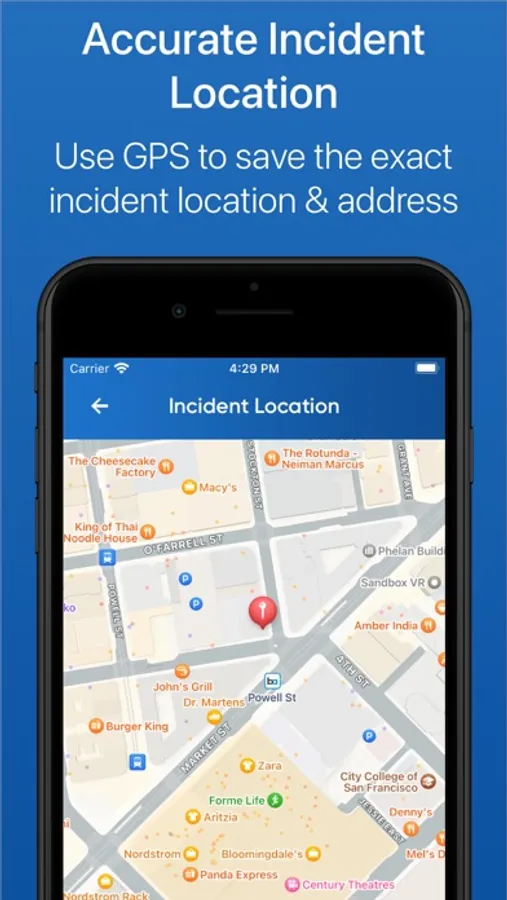 - No need to waste time searching for the address where the incident occurs. Just tap a button to lookup the address automatically (using the phone's GPS).