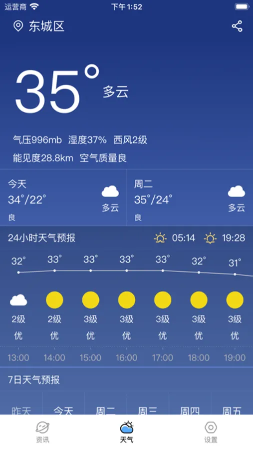 一款能随时查询多地天气数据的工具软件,为用户提供天气及各种指数信息查询服务。该APP涉及的主要模块为天气数据,天气数据包括“实时天气数据”、“24小时天气预报”、“7日天气预报”。