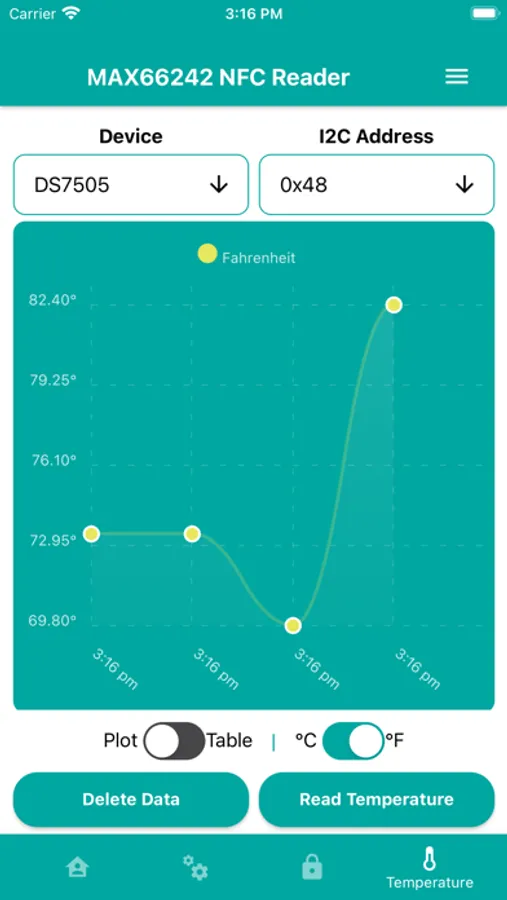 In addition to the RF interface, the MAX66242 also has an I2C interface that allows you to read temperature via DS7505 and MAX31875 sensors. Store and display previously read temperature on graph.