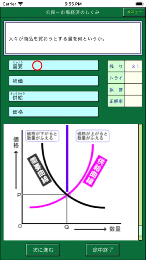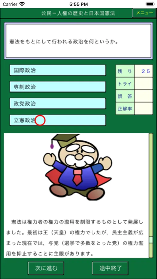 ・1問1答では,正解削除機能により,間違った問題が繰り返し出題されます。