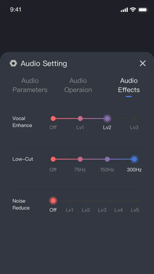 1. [Sound effect setting] You can set rich audio parameters in the APP to record high-quality audio efficiently. For example, the sampling rate, bit depth, audio noise reduction, low cut, vocal enhancement and other parameters can be flexibly set according to the needs