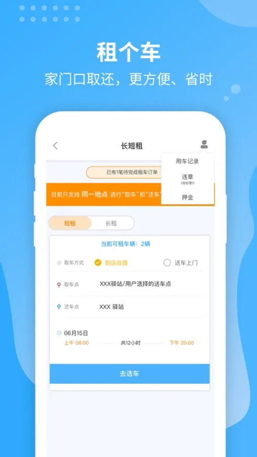 5、租个车:家门口取还车,并且提供日租、周末租、月租三种灵活租车方式