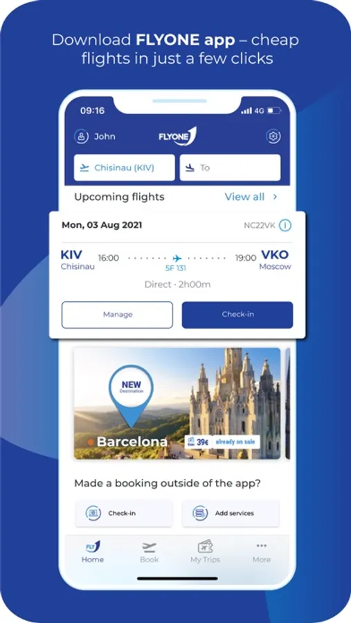 Download the FLYONE app - an interactive, intuitive and user-friendly platform for booking flights, checking in, receiving discounts, using vouchers and testing other smart options.