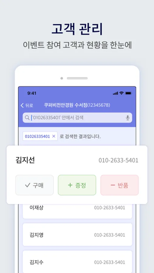 - 주요 기능 : 구매 등록 / 증정 등록 / 반품 등록