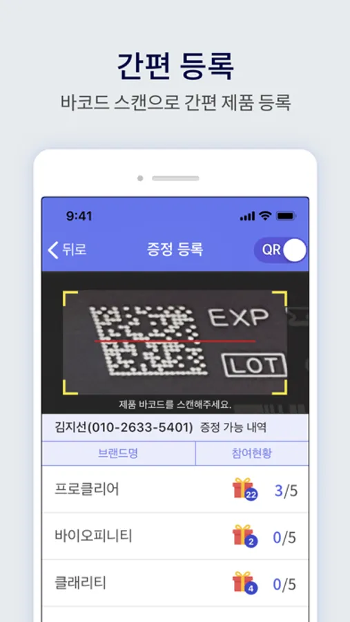 쿠퍼비전 제품을 스캔하여 손쉽게 소비자가 구매한 제품의 스탬프를 등록하고 관리할 수 있습니다.