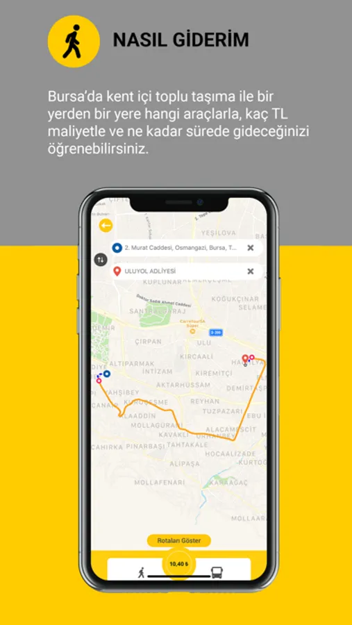 Bulunduğunuz yerden Bursa’nın herhangi bir yerine toplu taşıma kullanarak nasıl gideceğinizin cevabı BursaKart Mobil’de. Nasıl giderim fonksiyonu ile nereye gideceğinizi yazmanız yeterli, BursaKart Mobil size en hızlı ve en ekonomik hali ile nereye,nasıl gideceğinizi rota üstünde gösterir. Size sadece seyahatin keyfini çıkarmak kalır.