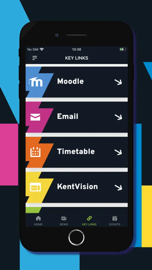 In the app you will find links to key systems including Moodle, your timetable, and emails.