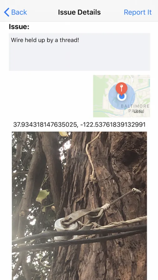 Help your local utility company keep your neighborhood safe by issuing a report including a photograph, description, and location information (both GPS and address) of issues with wires, poles and trees.